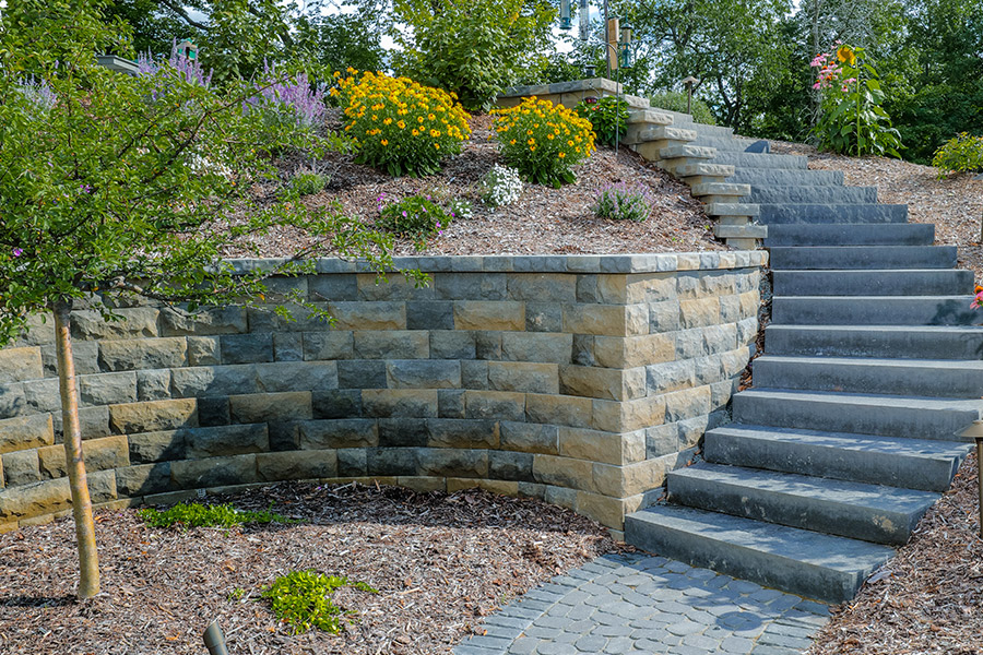 A graceful, curving staircase leading seamlessly down to a serene lower patio.