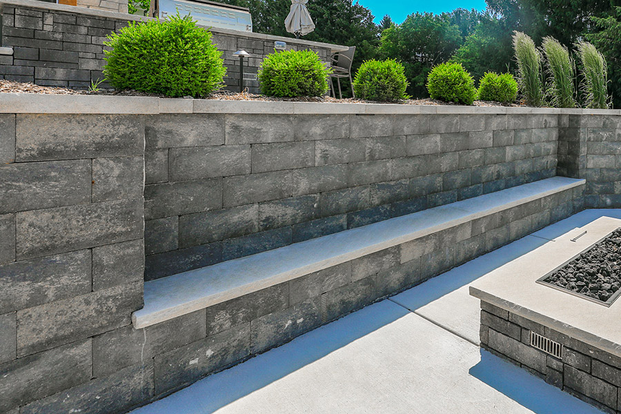 A substantial stone seat seamlessly integrated into the retaining wall for sitting at the fire table.