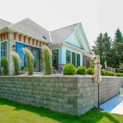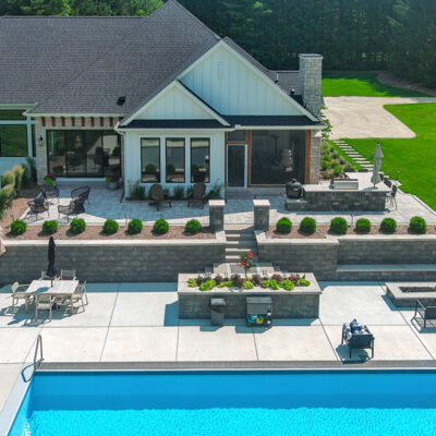 The custom bar island is constructed with Belgard Pewter Tandem Wall, offering texture and durability while complementing the patio’s modern color palette. Structural support and clean elevation changes are achieved with a Belgard Diamond Pro retaining wall, ensuring both long-term performance and cohesive design.