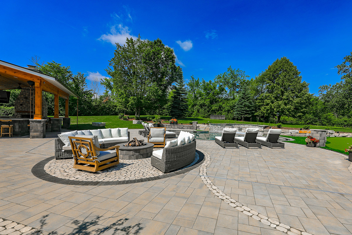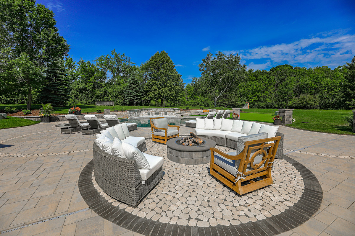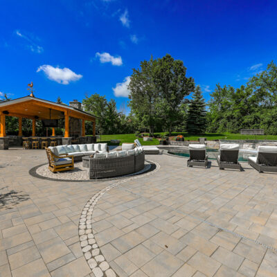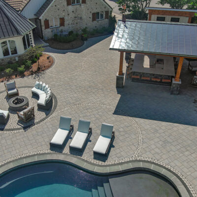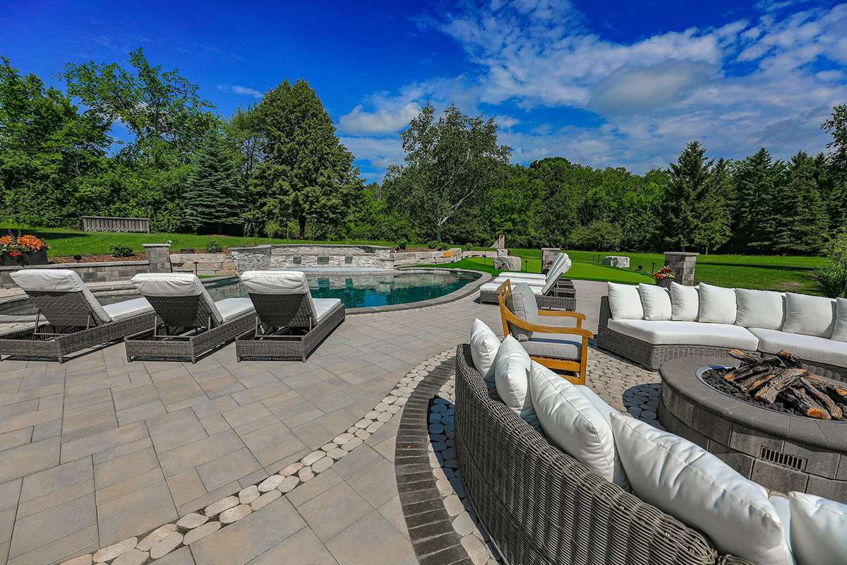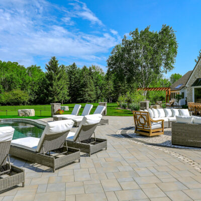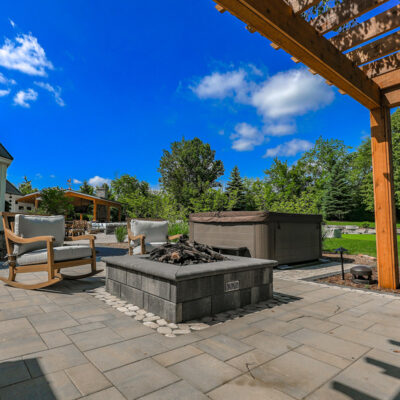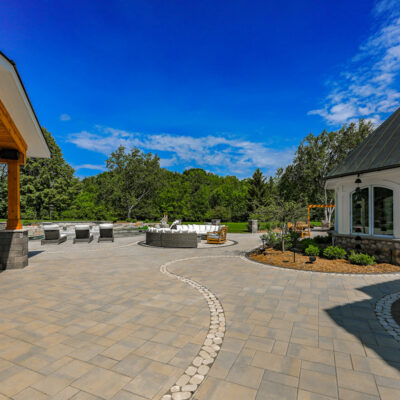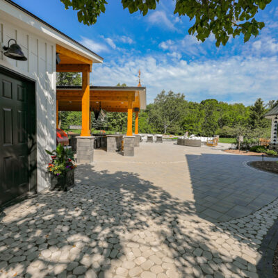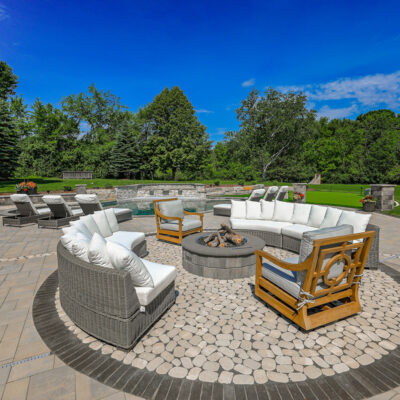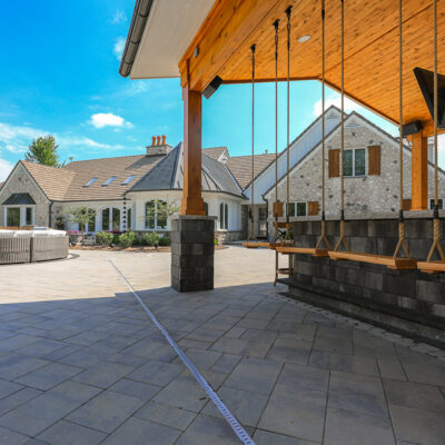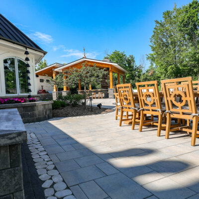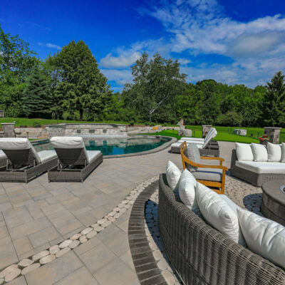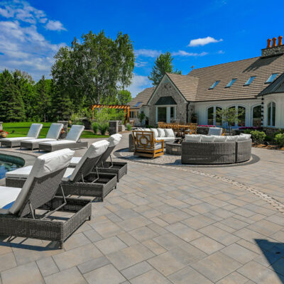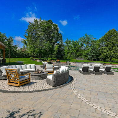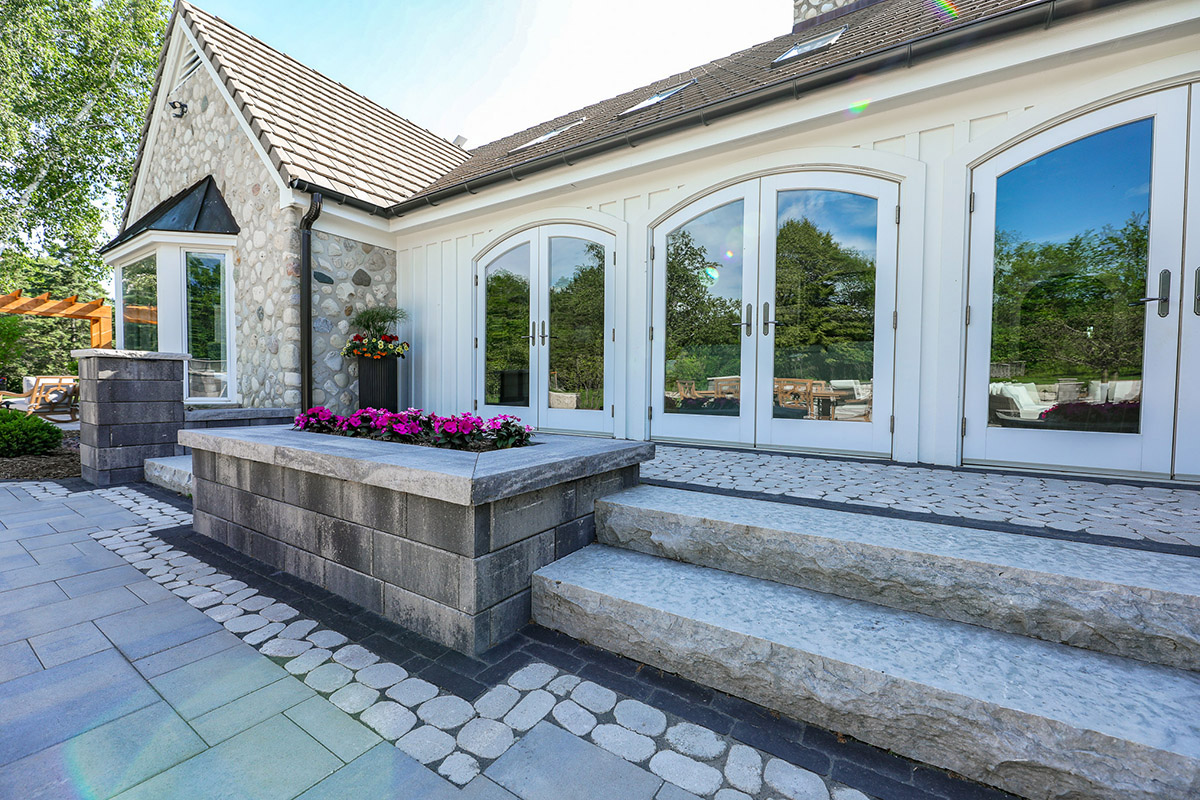 The material palette ties the entire project together with texture and durability. The patio showcases Belgard Moonlight Cobble paired with Belgard Dimensions 12 in Scandina Gray, creating a refined yet timeless aesthetic. Thermal top Lannon stone steps add natural character and a clean, finished look while providing seamless transitions throughout the space.