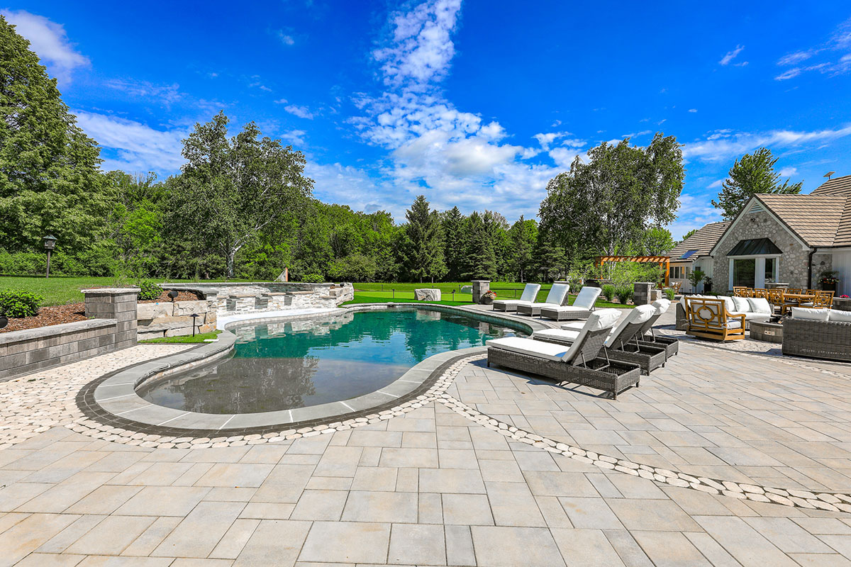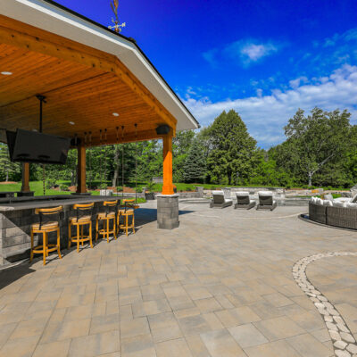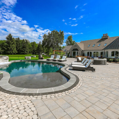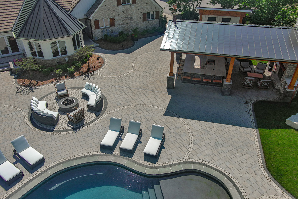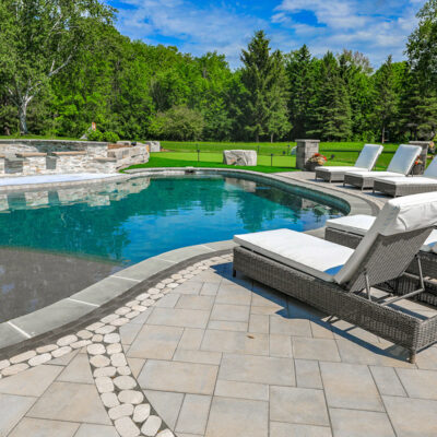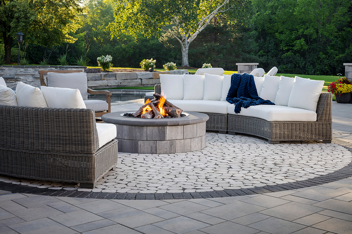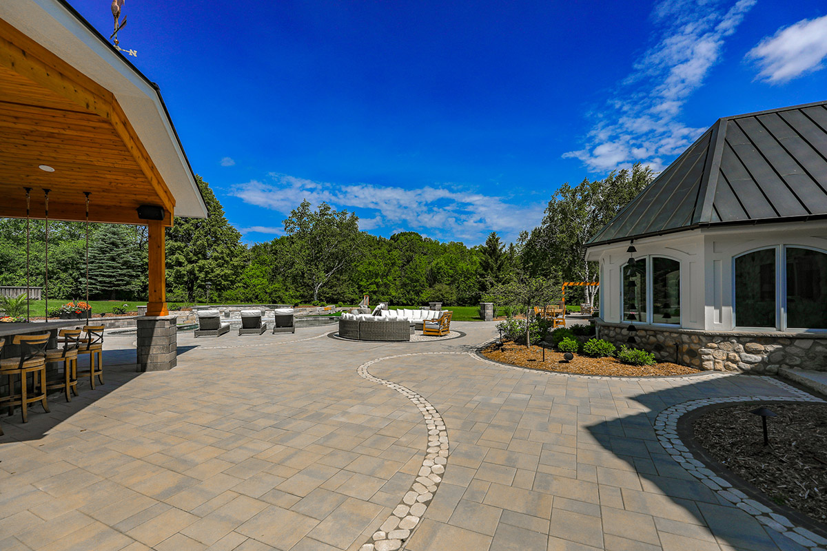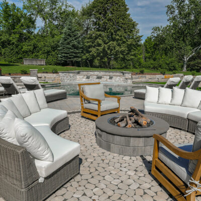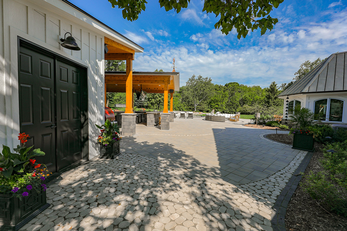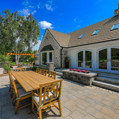 The material palette ties the entire project together with texture and durability. The patio showcases Belgard Moonlight Cobble paired with Belgard Dimensions 12 in Scandina Gray, creating a refined yet timeless aesthetic. Thermal top Lannon stone steps add natural character and a clean, finished look while providing seamless transitions throughout the space.