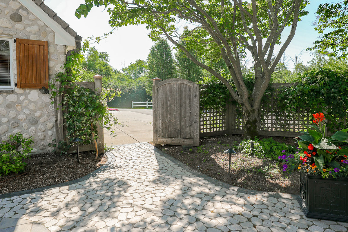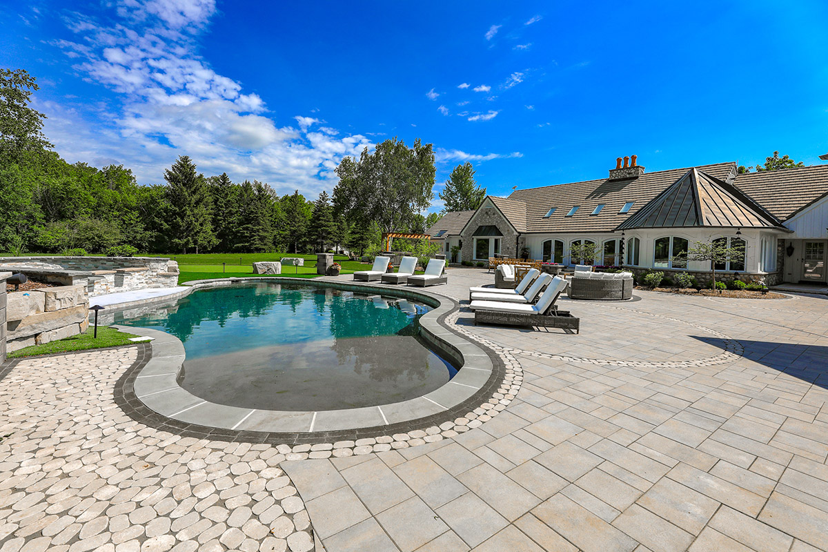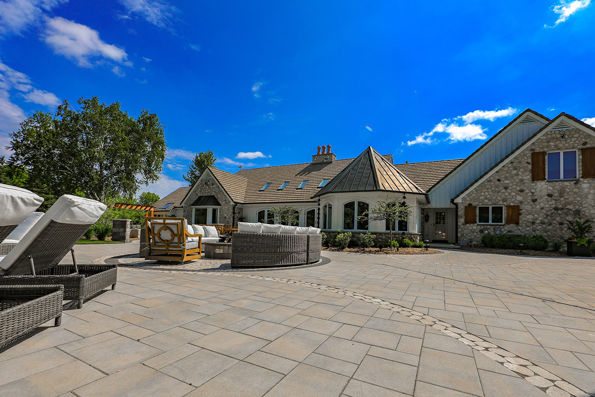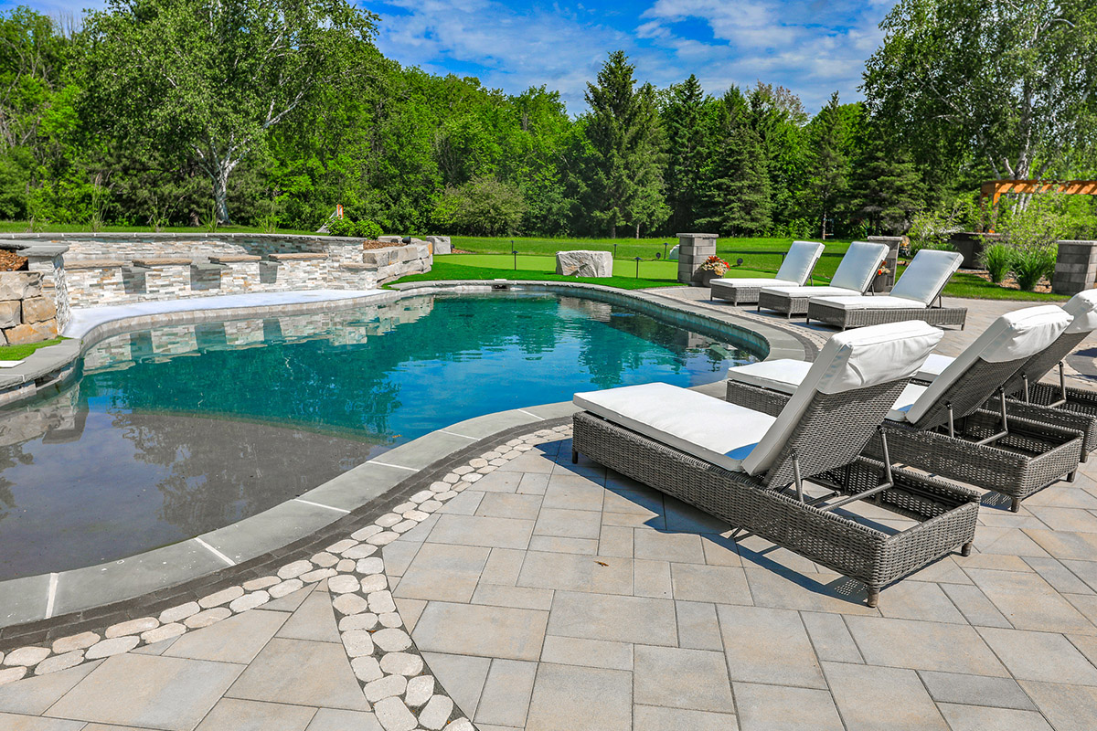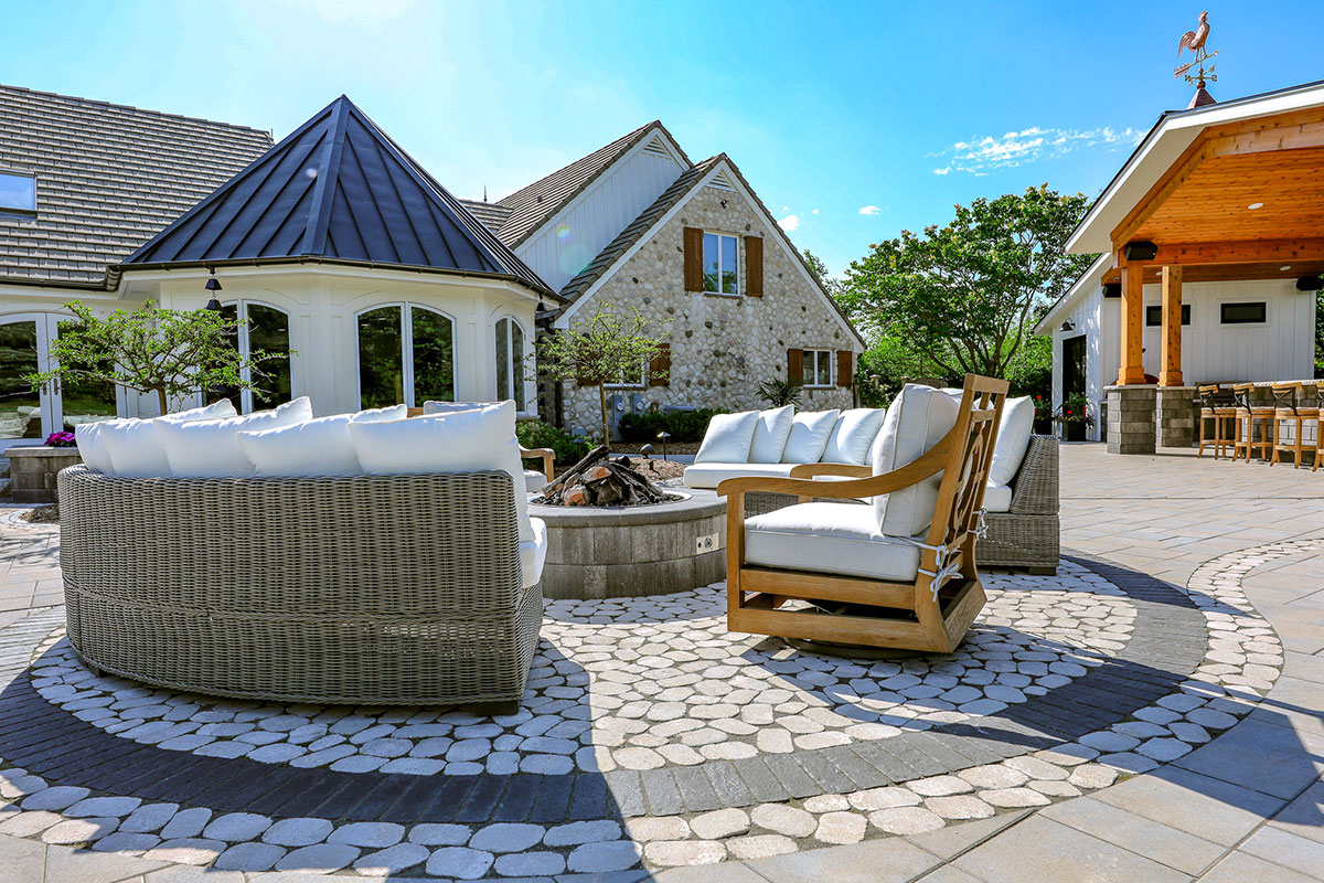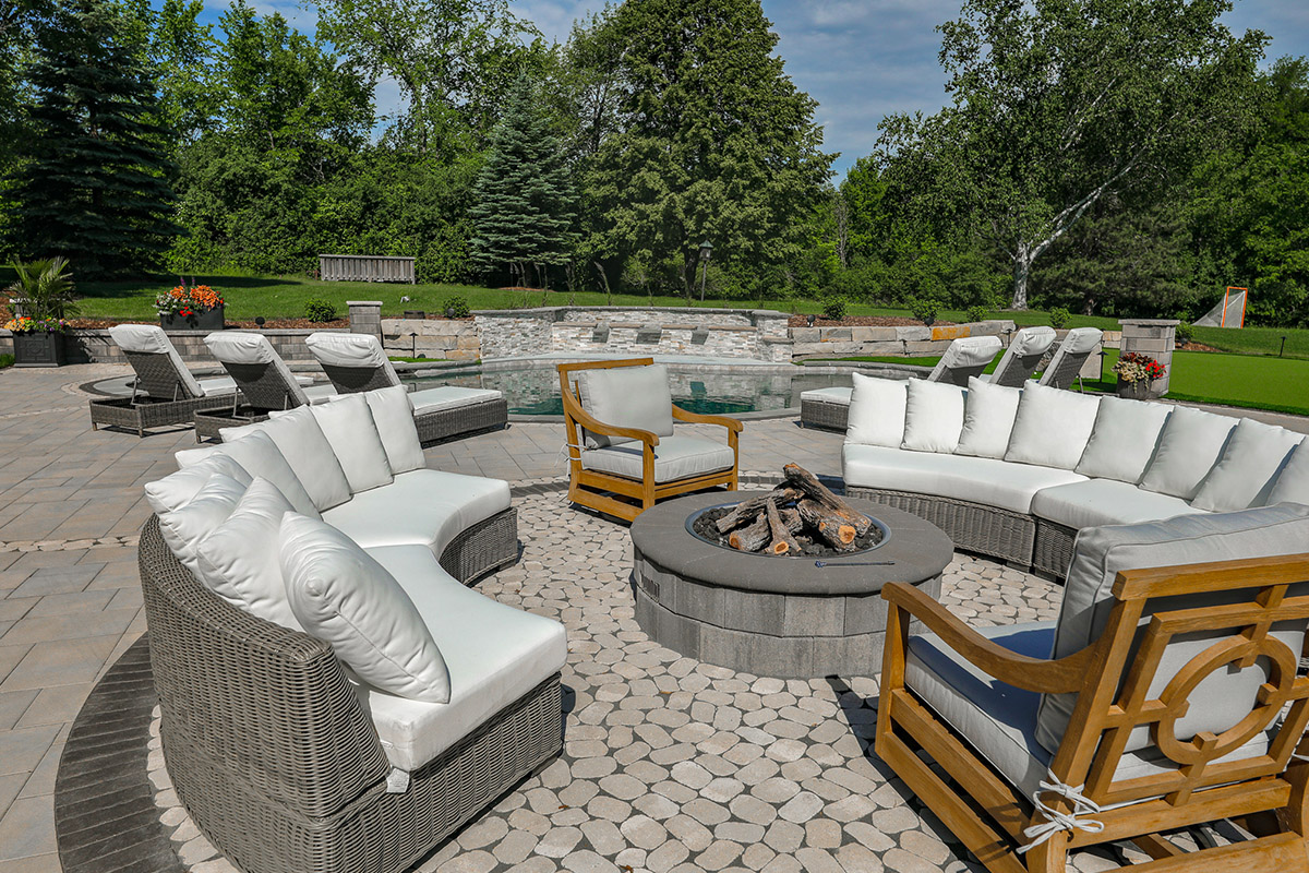 The material palette ties the entire project together with texture and durability. The patio showcases Belgard Moonlight Cobble paired with Belgard Dimensions 12 in Scandina Gray, creating a refined yet timeless aesthetic. Thermal top Lannon stone steps add natural character and a clean, finished look while providing seamless transitions throughout the space.