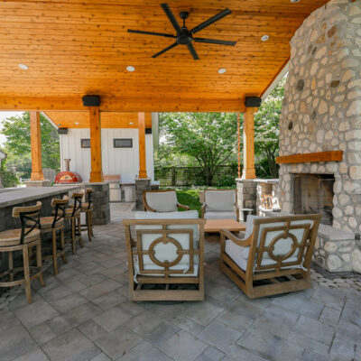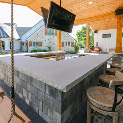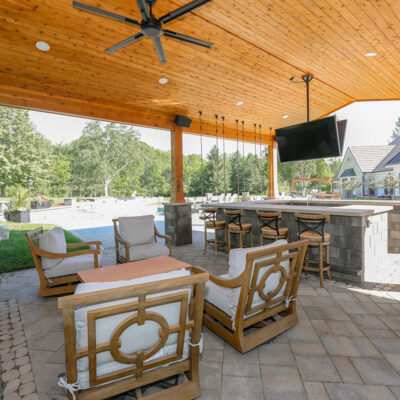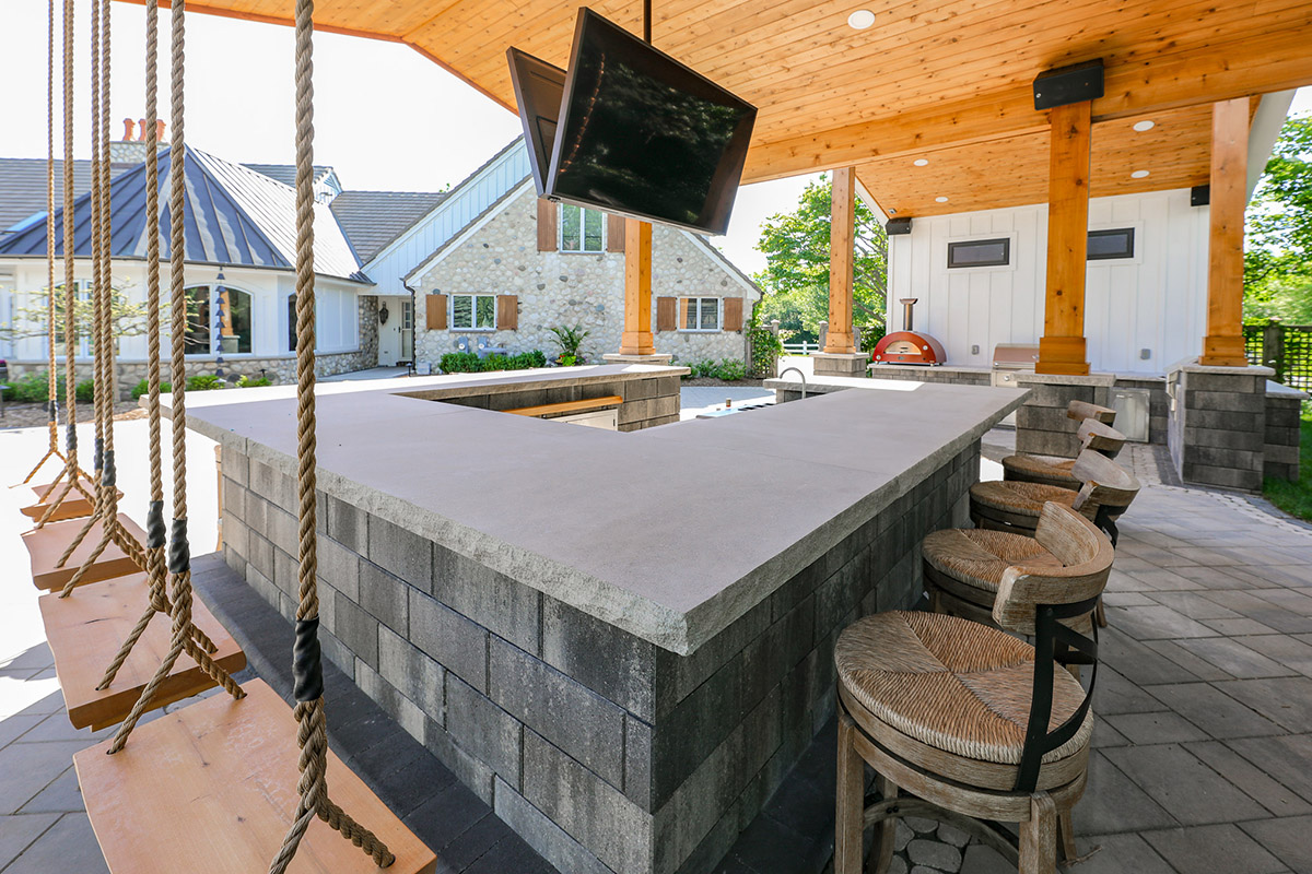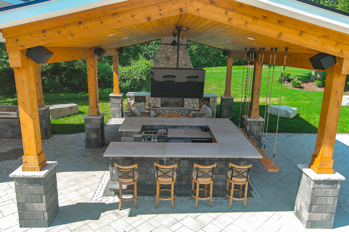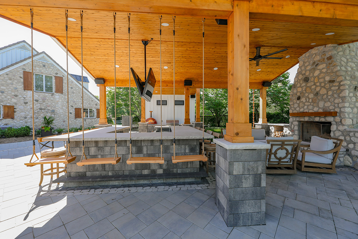At the center of the design is a covered pavilion that anchors the backyard. Built for year-round enjoyment, the pavilion features a built-in fireplace, a fully equipped grill and kitchen, and attached storage for convenience and organization. Inside, guests are welcomed by a custom bar and comfortable seating, including swings suspended along one side of the bar—adding a unique, relaxed charm to the space.