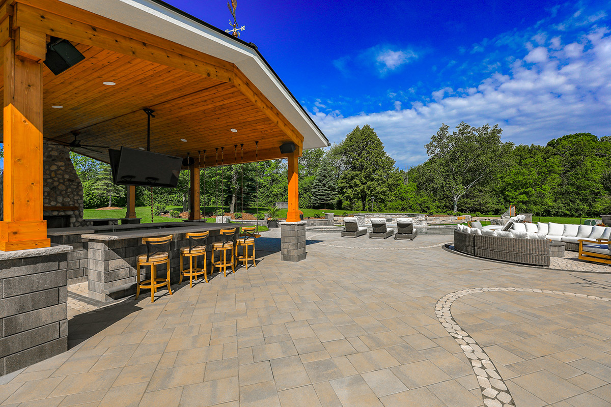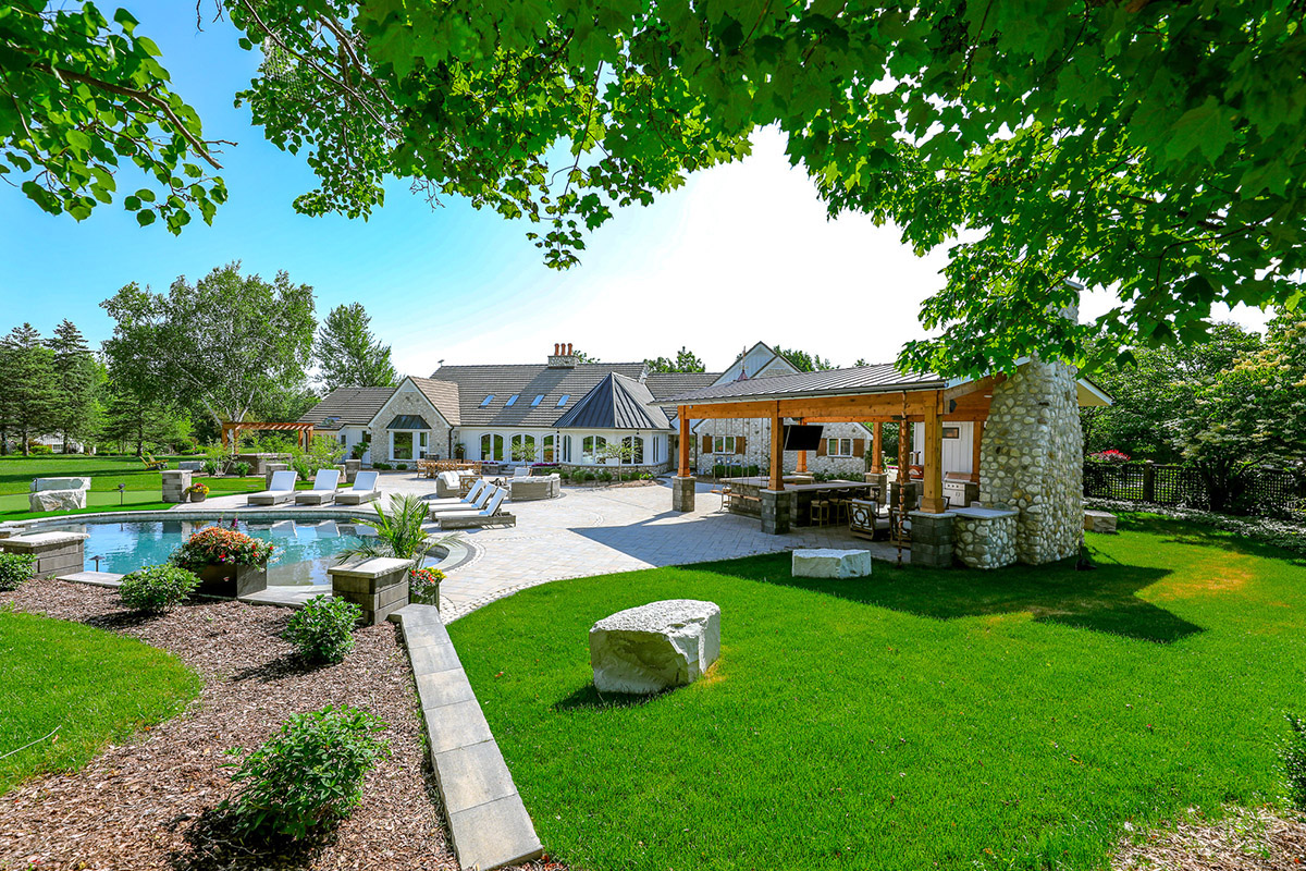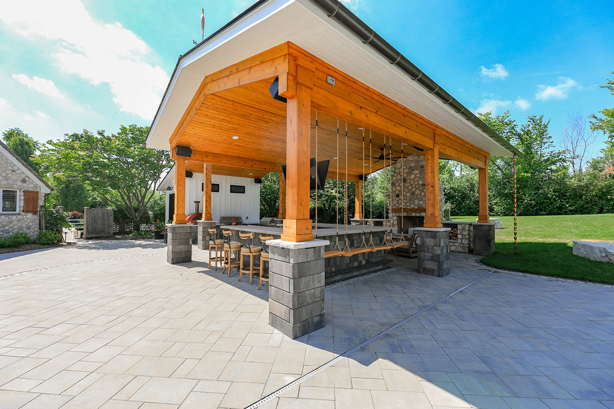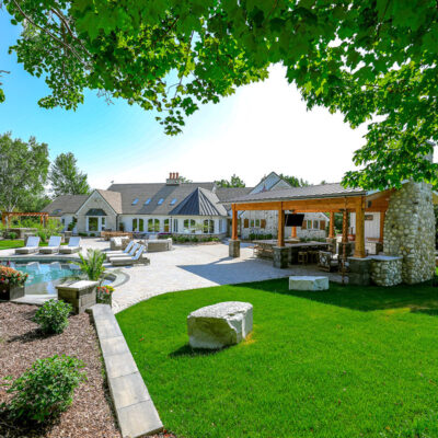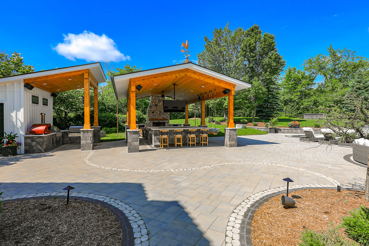 At the center of the design is a covered pavilion that anchors the backyard. Built for year-round enjoyment, the pavilion features a built-in fireplace, a fully equipped grill and kitchen, and attached storage for convenience and organization. Inside, guests are welcomed by a custom bar and comfortable seating, including swings suspended along one side of the bar—adding a unique, relaxed charm to the space.