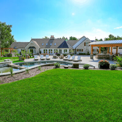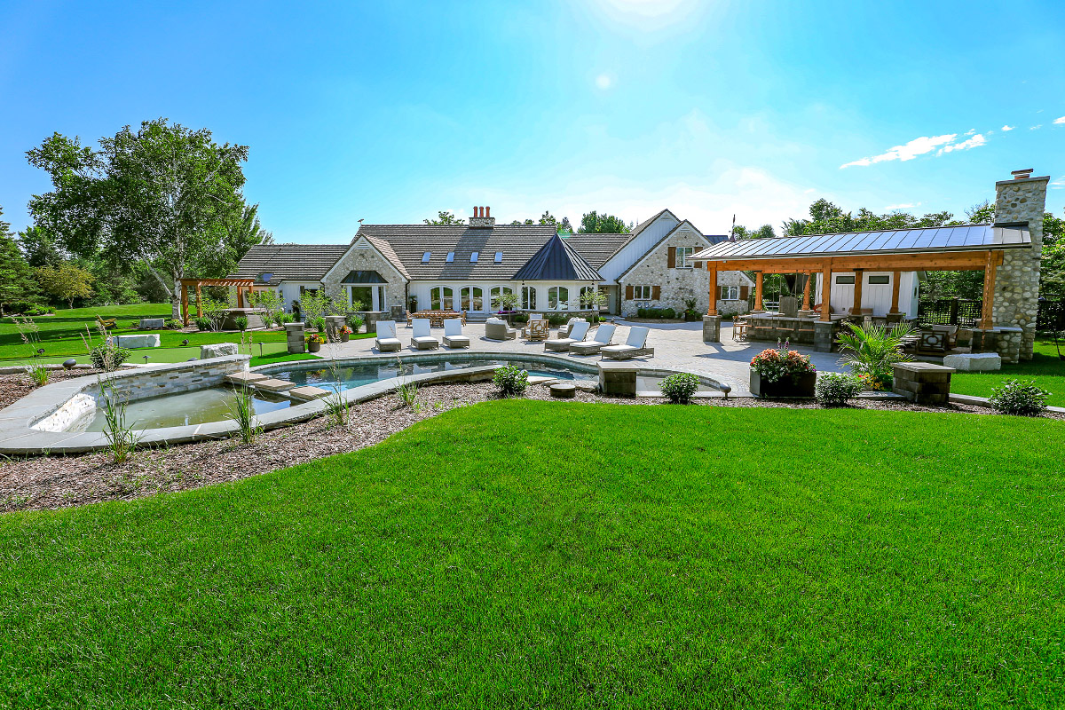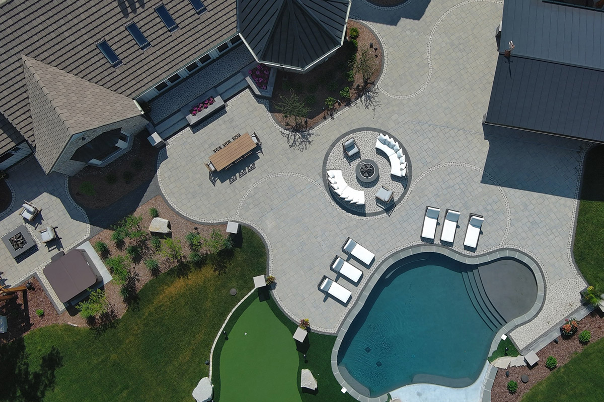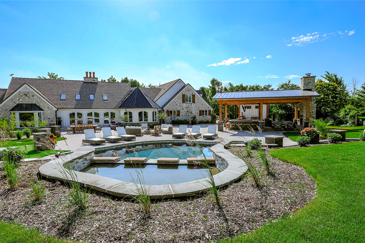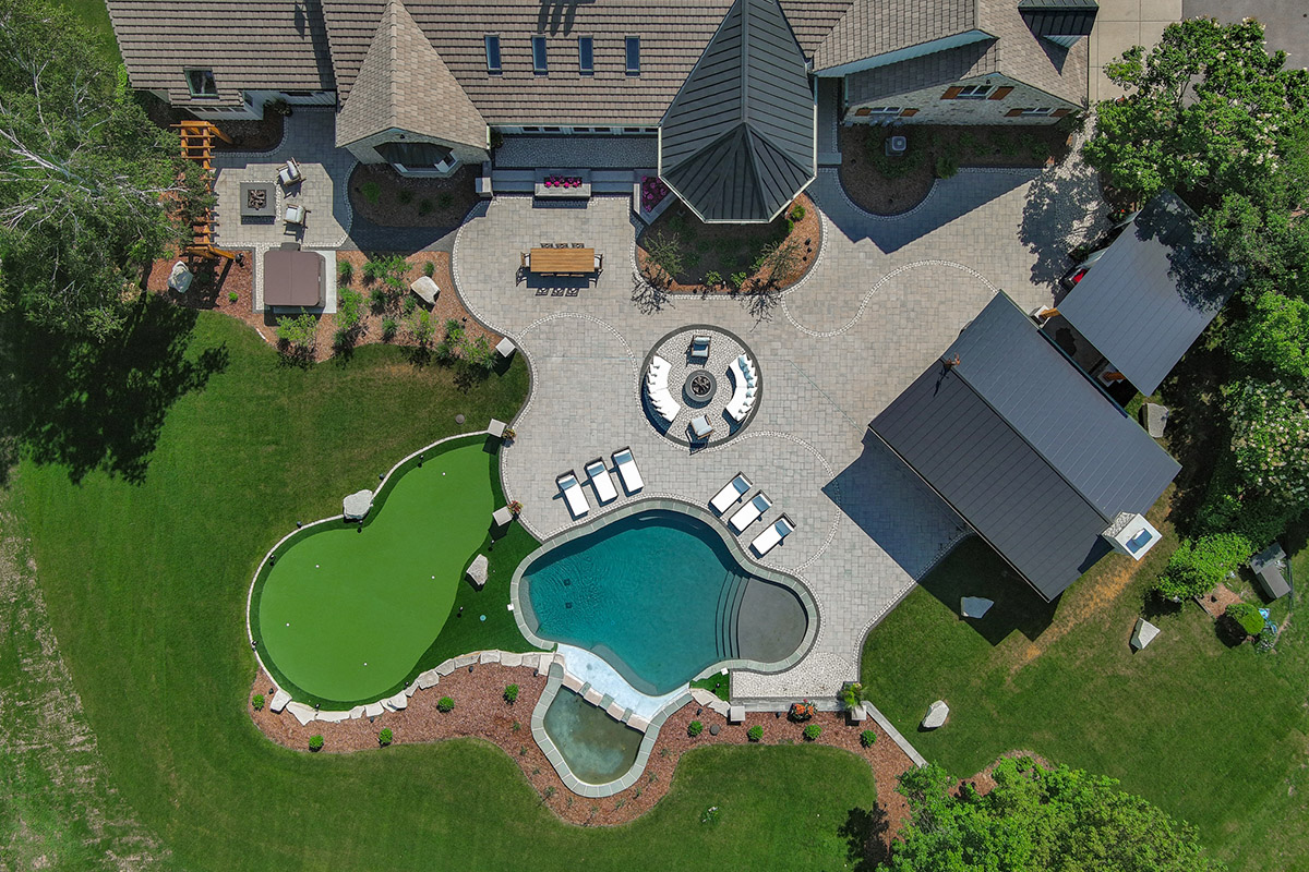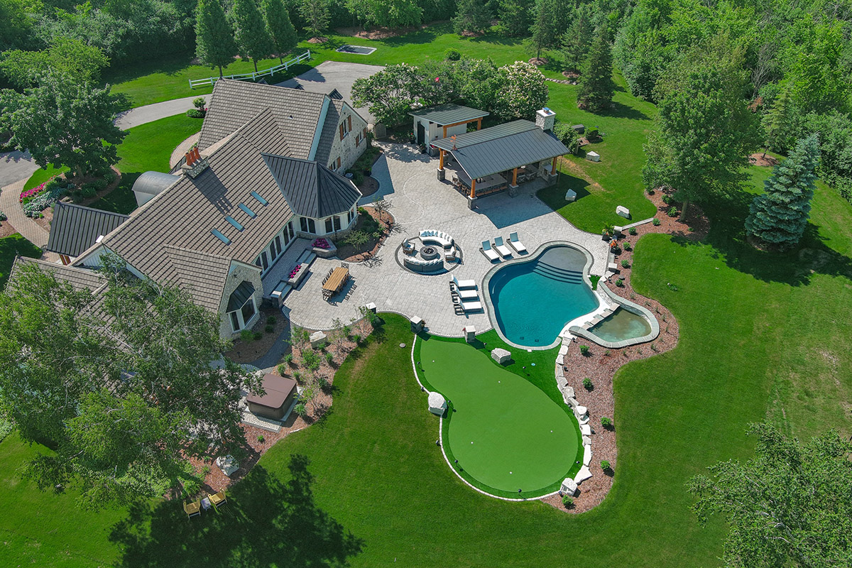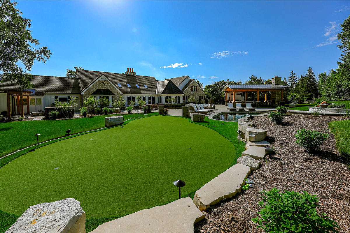 The large patio extends outward to create distinct entertainment zones. A fire pit offers a cozy focal point for conversation, while a dedicated dining area accommodates outdoor meals with ease. A custom putting green introduces a playful, interactive element, and a pergola with a swinging daybed provides the perfect shaded retreat for lounging poolside.